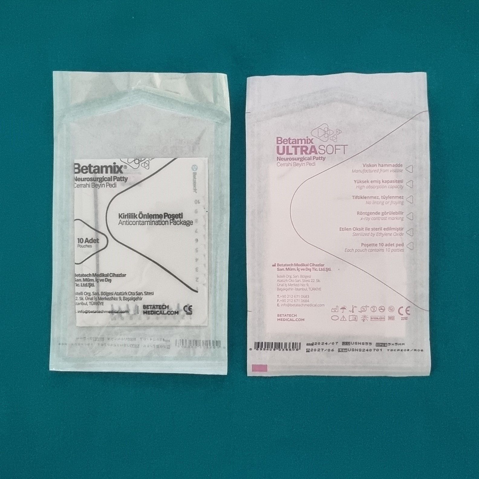 10 sterile patties are mounted on the counting card, which is supplied inside an easy peel sterile pouch. Each sterile pouch is fully labelled including with the GTIN bar code.